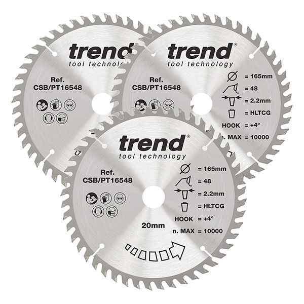 Trend Craft 165mm Diameter Plunge Saw Panel Trim Saw Blades (3 Pack) is a range of tungsten carbide-tipped blades for wood and wood-based materials. For use in circular, plunge, and table saws, Trend Laminate & HPL blades deliver precise, clean cuts. Ideal for laminated and veneered panels, compact laminate, and melamine faced chipboard.