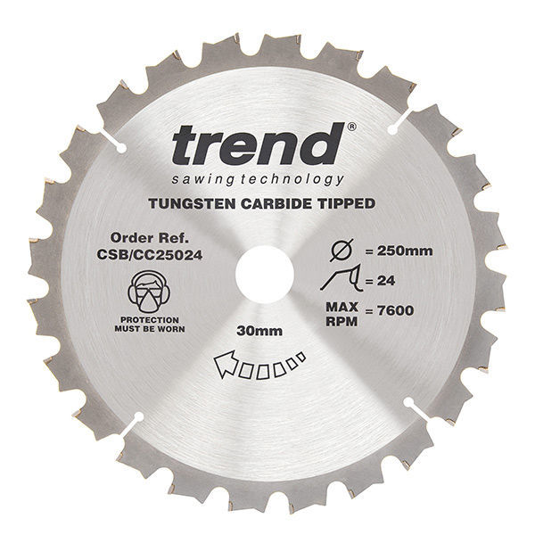 Trend Craft Crosscut Saw Blade 250mm Diameter x 24 Teeth x 30mm Bore x 3mm Kerf is a range of tungsten carbide tipped blades for cross-cutting wood and wood-based materials using Mitre and Radial Arm saws. Ideal for timber skirting boards, architraves, floorboards, window boards, cladding, and decking.