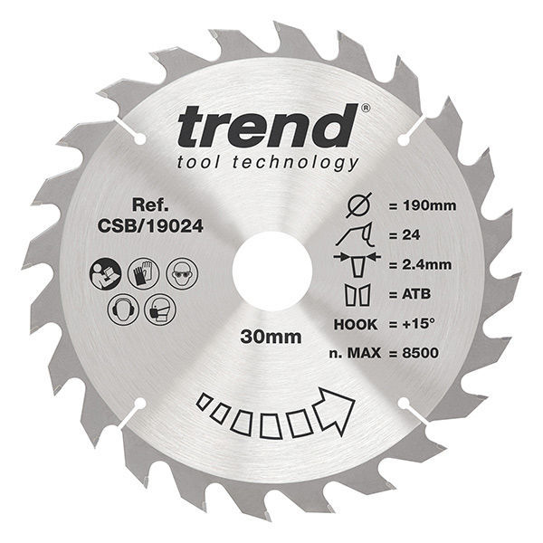 Trend Craft General Purpose Saw Blade 190mm Diameter x 24 Teeth x 30mm Bore x 2.6mm Kerf is a range of tungsten carbide tipped blades for wood and wood-based materials. For use in circular, plunge, and table saws, and available in a range of finishes. Ideal for ripping and trimming softwood, hardwood, plywood, MDF, and hardboard.